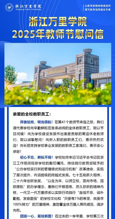 校董會董事應(yīng)敏、蔣建軍、錢國英,秘書長王福銀,副校長楊震峰、葛楚天、余丹,浙江省萬里教育集團副總裁、校長助理談豪杰,校長辦公室(黨委辦公室)、教師工作部、人事處、余姚創(chuàng)新研究院、相關(guān)學(xué)院負責(zé)同志參加慰問活動。